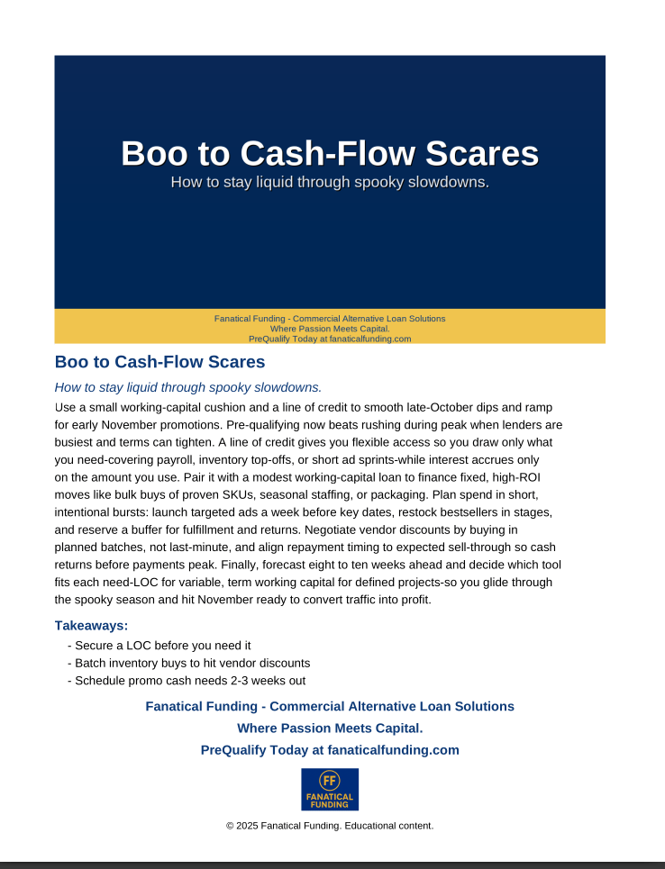 Finally, forecast eight to ten weeks ahead and decide which tool fits each need-LOC for variable, term working capital for defined projects-so you glide through the spooky season and hit November ready to convert traffic into profit.