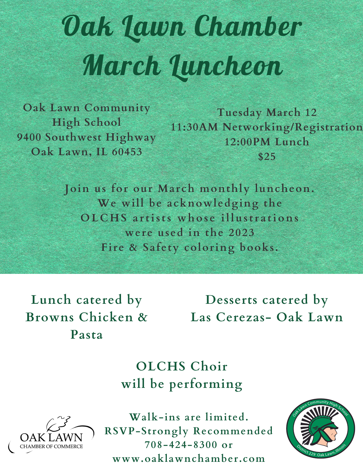 Enter OLCHS campus from 95th Street heading north on Austin Ave. Follow signs for event parking. Enter main lobby entrance (Spartan Lobby Entrance) and you will be directed to luncheon location.