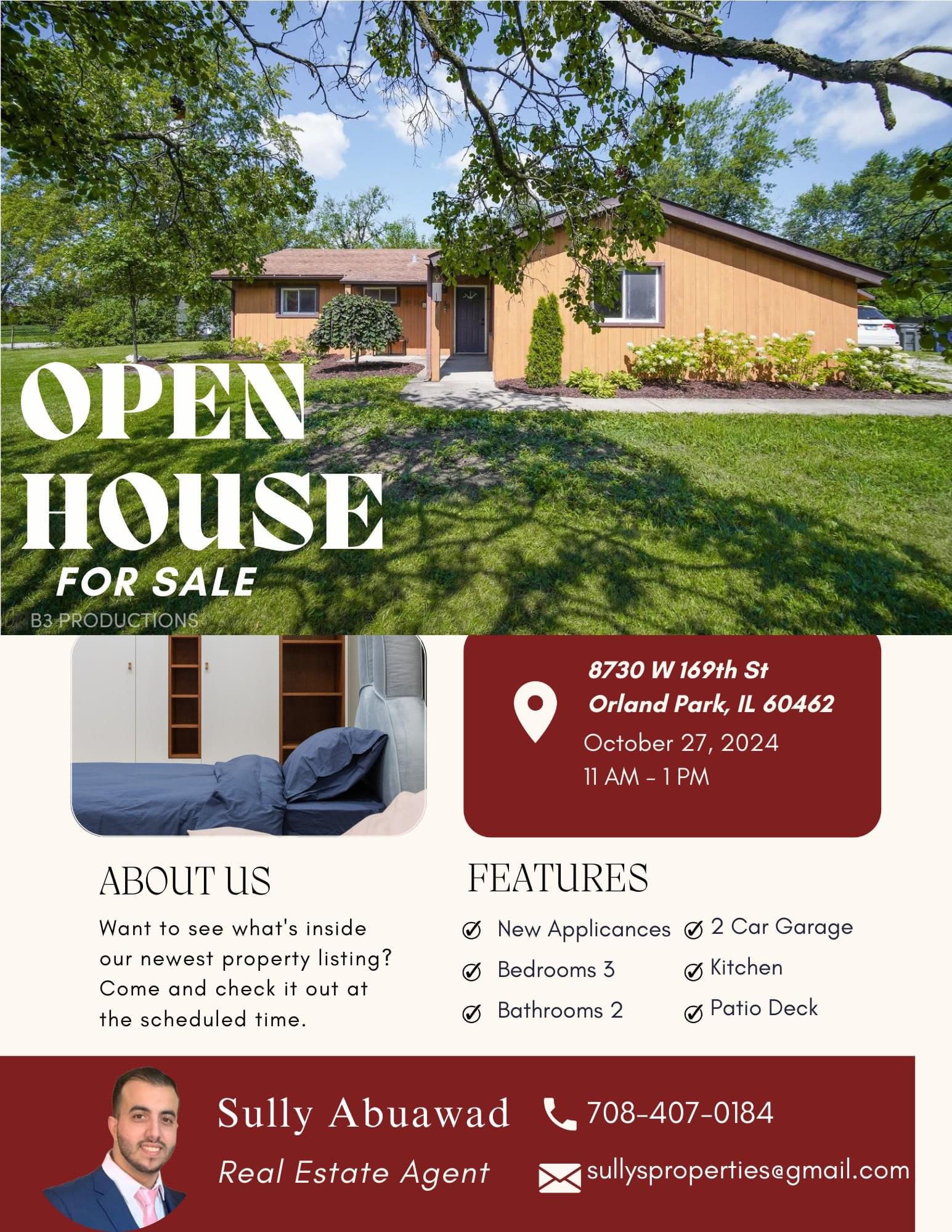 You’re invited to an Open House on Sunday, October 27, 2024, from 11 AM to 1 PM, at 8730 West 169th St, Orland Park, IL 60462. Explore this beautiful property featuring: 3 spacious bedrooms 2 bathrooms 2-car garage Modern kitchen Enjoy complimentary snacks and coffee as you tour the home! Whether you’re actively searching or just curious, this is a great chance to see if this could be your dream home. Admission is free, but guests will be required to sign in upon entry. Our real estate agent, Sully Abuawad, will be available to answer any questions and assist with any details. 📅 Date: Sunday, October 27, 2024 ⏰ Time: 11 AM – 1 PM 📍 Location: 8730 West 169th St, Orland Park, IL 60462 For more information, contact Sully Abuawad at 708-407-0184 or email sullysproperties@gmail.com. We look forward to seeing you—come for the home, stay for the snacks and coffee! ☕🏡